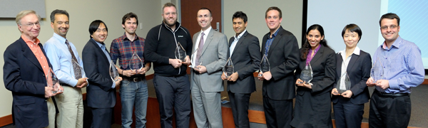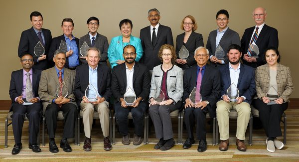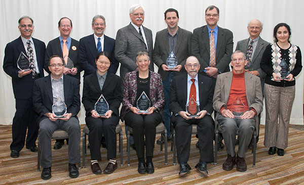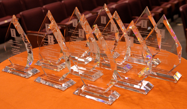 The recipients of the 2017 Illinois Computer Science Alumni Awards. Seated (from left): Rajesh Karmani, Nikil Dutt, James E. Smith, Aditya Parameswaran, Marianne Winslett, Kishor Trivedi, Andrei Åžtefănescu, and Svetlana Lazebnik. Standing (from left): Isaac J. Hall, Richard M. Schell, Steven Ko, Drina C. Yue, Interim CS Department Head Vikram Adve, Jill Zmaczynski, Xiang Ren, and Scott Fisher.The recipients of the 2016 Illinois Computer Science Alumni Awards. Seated (from left): Milos Gligoric, Yu Pan, Dan Kaufman, Andreas Kloeckner, Le Xu, Steven Ashby, and Yizhou Sun. Standing (from left): Rosalind Weinberg (for Michael Faiman), Romit Roy Choudury, Michael Hughes, Thomas Dietterich, Marcin Kleczynski, CS Department Head Rob A. Rutenbar, Carl Dill, and Ed Reingold.2015 Illinois Computer Science Award recipients. Seated, from left: Pete Koomen, John Criswell, William Dunn, Paul Saylor, Jackson Hu, Lynn Reedy, and Rick Cattell. Standing, from left: Nancy Amato, Luis Ceze, Apu Kapadia, Rob A. Rutenbar, Russ Simmons, Dave Paola, and Cosmin Radoi.2014 Illinois Computer Science Award recipients. Seated, from left: Alan M. Braverman, Cinda Heeren, Brigid A. Johnson, Parisa Tabriz, Linda Petzold, and Der-Tsai Lee. Standing, from left: Roy H. Campbell, Siva Kumar S. Hari , Michael T. Heath, C. William Gear, Marc Snir, Trevor Mudge, Kenichi Miura, Daniel A. Reed, Franco P. Preparata, Lawrence Angrave, Jason Cong, and Koushik Sen.2013 Illinois Computer Science Alumni Awards Winners. Seated, from left: Jed Taylor, Shan Lu, Sandra Rankin, H. George Friedman, and William Kubitz. Standing, from left: Mehdi Harandi, Channing Brown, Sam Kamin, Dennis Mickunas, Steven LaValle, CS Department Head Rob Rutenbar, Milos Ercegovac, and Svetlana Lazebnik.2012 Illinois Computer Science Alumni Awards Winners (l to r): David J. Kuck, Ran Libeskind-Hadas, Sizhao Yang, Roger Dickey, Ari Gesher, Milos Prvulovic, Amitt Mahajan, Joel Poloney, Pooja Agarwal, Xiasong Ma, Robert L. Bocchino Jr.Illinois Computer Science Awards Trophies