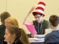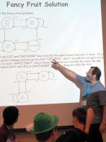 The students with the hats were following rules dictated by a finite state machine, a simple model of a computing device. The rules were provided by CS Professor Lenny Pitt, who was leading a 4-H summer camp on computer programming.