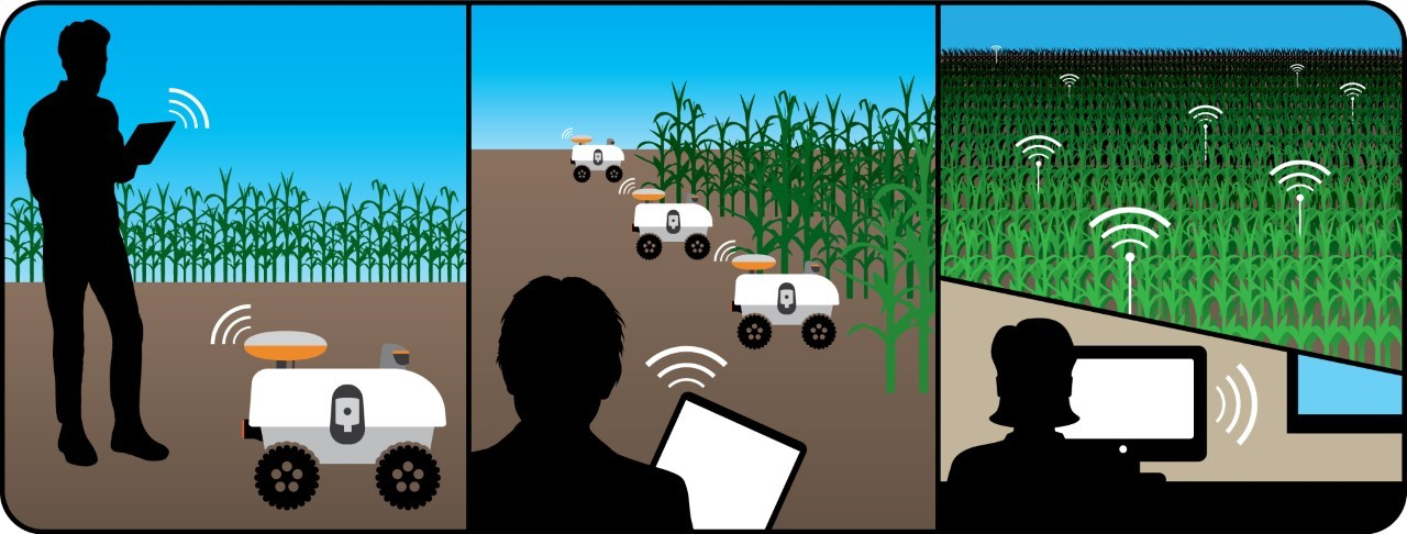 At the end of the four-year project, the team will test its robots in the Illinois Autonomous Farm testbed, advancing the science and practice of coordinated agricultural robotics. A major component of this testbed are agbots designed and built by CS Associate Professor Girish Chowdhary, the creator of TerraSentia, a compact and teachable robot that uses a number of sensors to collect data on crop health, as well as machine learning-based analytics to convert this data into actionable insights for farmers.