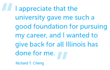 “I appreciate that the university gave me such a good foundation for pursuing my career, and I wanted to give back for all Illinois has done for me,” said Cheng, who recognizes the financial challenges that today’s students face. “I was trying my best to help out... so young people can pursue their dreams.”