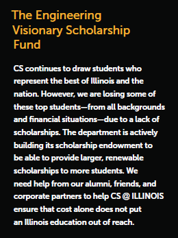“By donating, you’re investing in your own future, as well as a student’s future,” Poloney said. “You will surely work with many CS @ ILLINOIS alumni—keeping the talent pipeline strong will benefit you, your company, and our industry.”