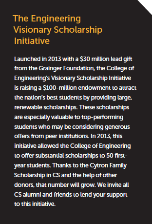 “The Visionary Scholars fund was a nice lever for combining my friend’s gift with additional funds to have a greater effect than the money on its own,” explained Cytron, who envisions the scholarship aiding students who are underrepresented in computer science. “I’d like to see students who couldn’t otherwise attend Illinois benefit from this scholarship.”