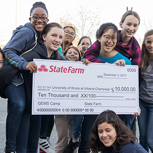 State Farm has made a $10,000 donation to CS @ ILLINOIS in order to help support the Gems Computer Science Camp for Girls. They presented the check as they hosted a meeting of the local Girls Who Code chapter, including many former Gems campers, at the State Farm Research & Development Center in the University of Illinois Research Park.