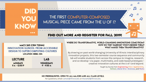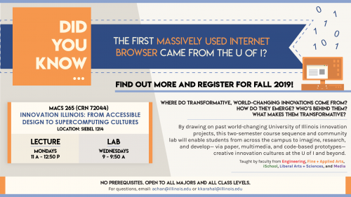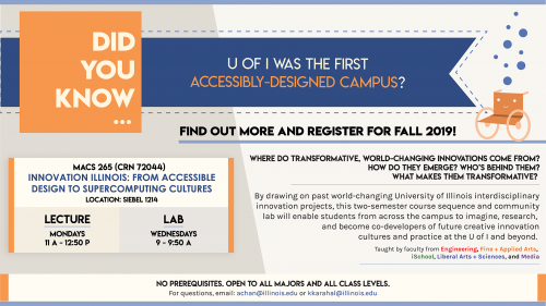 Innovation Illinois: From Accessible Design to Supercomputing Cultures is open to all majors and all class levels. It's listed as MACS 265 (CRN 72044) and will meet Mondays (11 a.m.-12:50 p.m.) and Wednesdays (9-9:50 a.m.) in Siebel Center for Computer Science Room 1214. For questions, email Professors Anita Say Chan (achan@illinois.edu) or Karrie Karahalios (kkarahal@illinois.edu). “We are working on cross-listings with the Department of Computer Science and the School of Information Sciences so there will be course numbers specific to both,” Chan said.